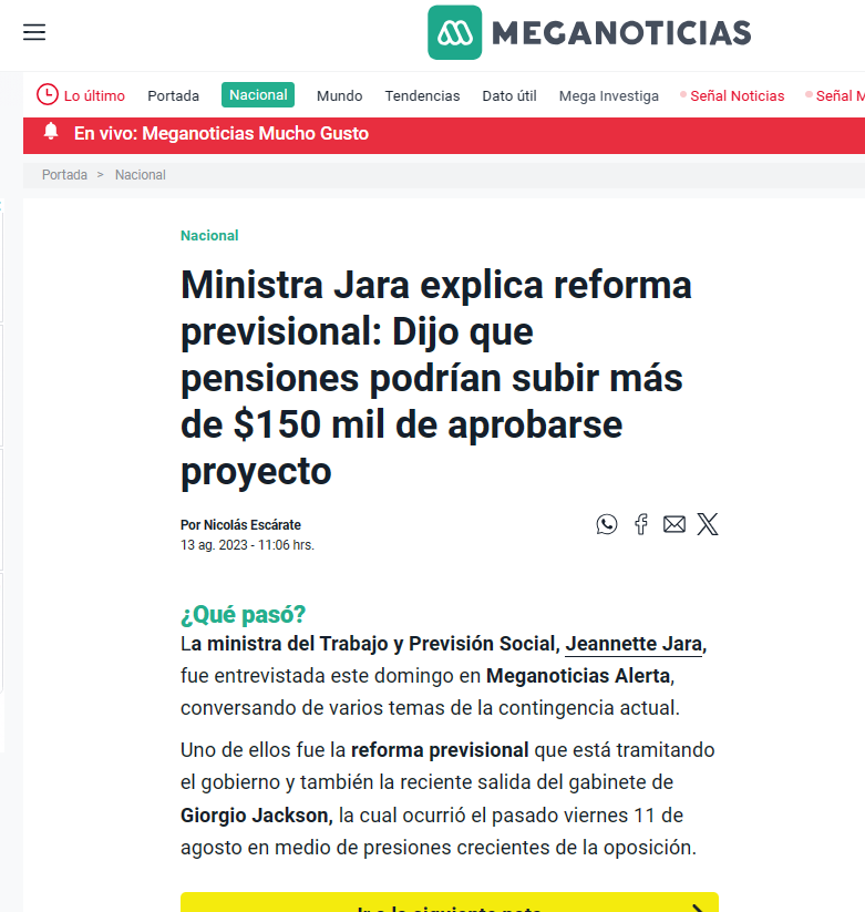 13 agosto 23: Ministra Jara explica por reforma: Dijo que pensiones podrían subir más de $150 mil