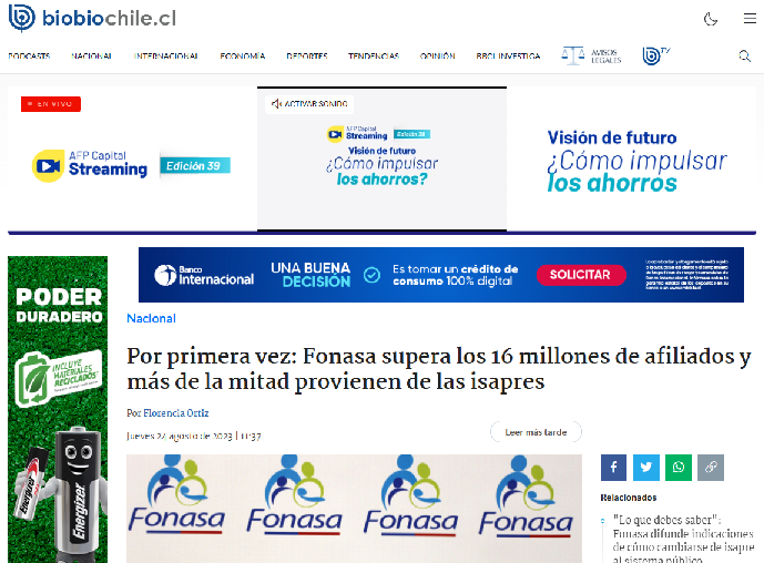 24 agosto 23: Por primera vez: Fonasa supera 16 millones de afiliados, la mitad proviene de Isapres