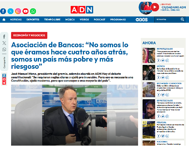 La Asociación de Bancos e Instituciones Financieras (ABIF) tiene un diagnóstico pesimista de la economía nacional pese a, por ejemplo, el fin de la alerta sanitaria, las coincidentes proyecciones hechas por el Ejecutivo respecto a la inflación, e incluso que esas mismas cifras coincidan con el Informe de Política Monetaria (IPoM). José Manuel Mena, presidente del gremio, explicó, la mañana de este lunes en ADN Hoy, que son dos los elementos que grafican la economía en general, y el mercado bancario en particular:
