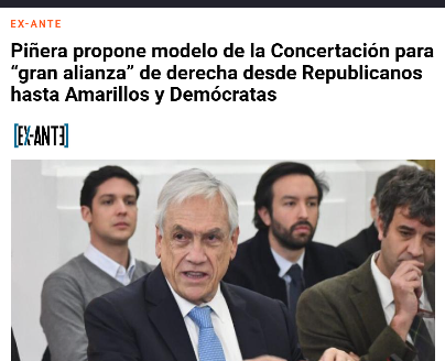 Piñera propone una alianza desde centro a derecha incluidos Republicanos, esta gran alianza buscaría según el expresidente la Unidad amplia del sector, propiciando primarias. Lo anterior en el contexto del crecimiento de Republicanos en votaciones y encuestas, los cuales han actuado con convicción y muy distante de las fuerzas de centro, criticando constantemente su actuar en conjunto con la izquierda.